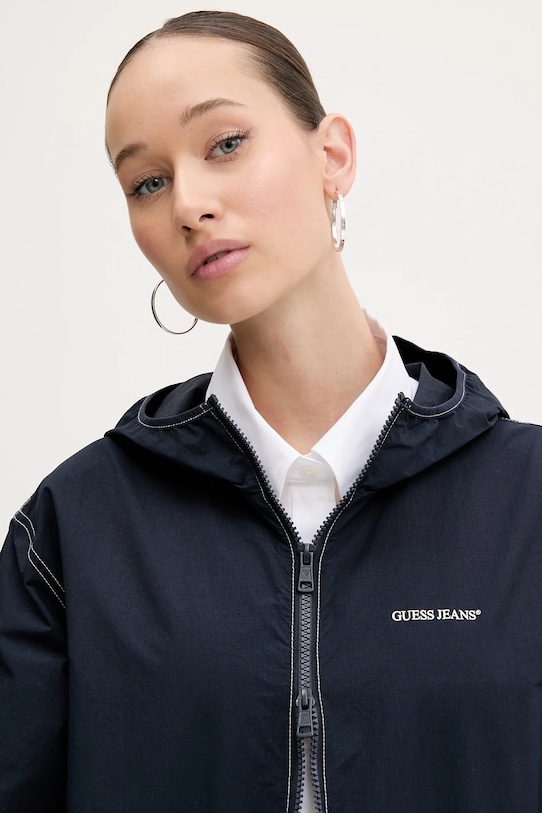 Куртка из коллекции Guess Jeans. Модель без подкладки, выполнена из гладкого материала. - Модель изготовлена из волокон, полученных с использованием экологически безопасных производственных процессов, что позволяет снизить воздействие на окружающую среду. - Простой дизайн, не стесняющий движений. - Застежка-молния. - Два прорезных боковых кармана на молнии. - Нижний край отделан завязками со стопорами, обеспечивающими индивидуальную посадку. - Неутепленная модель с подкладкой. - Длина рукава: 58 см. - Длина: 62 см. - Ширина под мышками: 52 см. - Размеры указаны для размера: S.