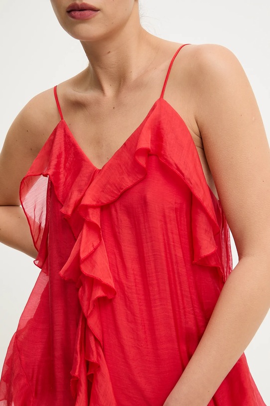 Это платье из коллекции Answear.LAB выполнено из тонкой, неэластичной ткани. Модель выполнена из дышащего материала с высоким содержанием лиоцелла. Лиоцелл — это шёлкоподобная ткань из древесной целлюлозы. Этот материал производится экологичным способом, без использования токсичных веществ. - Расклешенный крой. - Декоративный, заостренный вырез. - Модель на подкладке. - Модель с регулируемыми завязками. - Эластичная вставка сзади. - Модель с декоративными оборками. - Длина: 125 см. - Ширина под мышками: 34 см. - Ширина талии: 46 см. - Размеры указаны для размера: S.