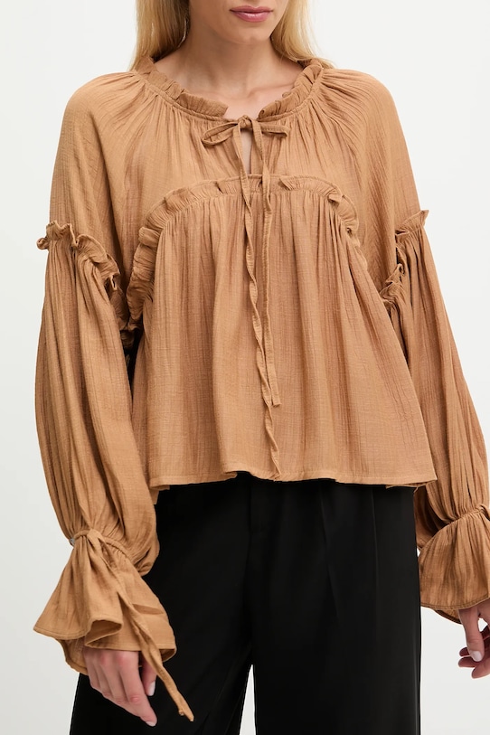 Эта блузка из коллекции Answear.LAB выполнена из гладкой ткани. Модель выполнена из дышащего вискозного материала. - Свободный крой, обеспечивающий полную свободу движений. - Декоративная окантовка по вырезу горловины. - Рукава реглан благодаря своей конструкции обеспечивают большую свободу движений. - Рукава отделаны удобными эластичными манжетами. - Модель с декоративными оборками. - Модель с декоративными завязками. - Тонкая, неэластичная ткань. - Длина рукава (от горловины): 75 см. - Длина: 58 см. - Ширина под мышками: 62 см. - Размеры указаны для размера: S.