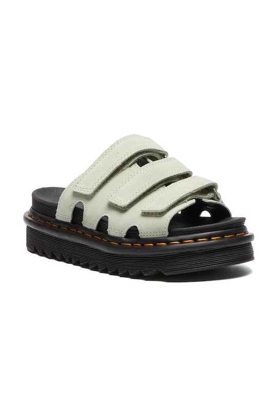 Шлёпанцы из коллекции Dr. Martens. Изготовлены из замши и оснащены кожаной подкладкой, которая обеспечивает комфорт и предотвращает натирание, потертости и появление неприятного запаха. - Ремешки с застежкой-липучкой для удобного застегивания позволяют индивидуально регулировать размер. - Кожаный салон. - Удобная стелька. Верх и подошва изготовлены по технологии Goodyear. Между ними расположена полоска материала, сваренная и прошитая, что обеспечивает водонепроницаемость. - Подошва из пеноматериала обеспечивает более мягкое ощущение и дополнительную амортизацию. - Платформенная модель.