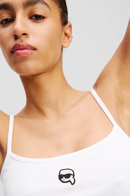 Топ из коллекции Карла Лагерфельда. Изготовлен из эластичной хлопковой ткани. - Органический хлопок выращивается без использования вредных химикатов, химических пестицидов и искусственных удобрений. - Приталенный крой. - Модель без бретелек. - Круглый вырез. - Модель выполнена из трикотажного полотна в рубчик. - Тонкий, эластичный трикотаж.