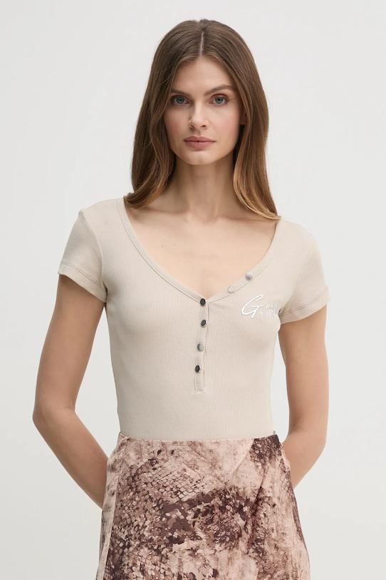 Приталенная футболка из коллекции Guess, выполненная из трикотажного полотна в рубчик. Модель выполнена из эластичного материала, который адаптируется к форме тела. - Этот продукт изготовлен из сертифицированного органического хлопка, который выращен и собран из растений, не содержащих ГМО, без использования химических удобрений и пестицидов. - Приталенный крой, подчеркивающий силуэт. - Декоративный, заостренный вырез. - Короткая планка с пуговицами. - Короткий рукав. - Модель с аппликацией. - Длина: 58 см. - Ширина под мышками: 38 см. - Размеры указаны для размера: S.