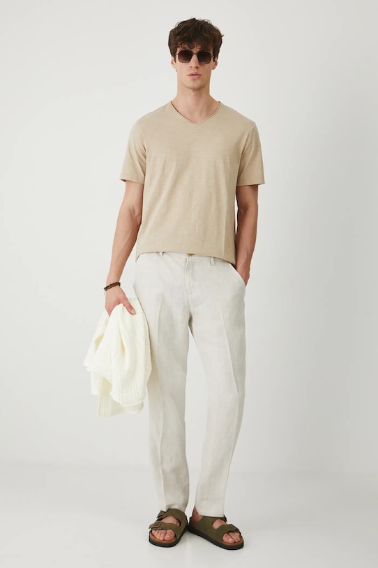 Брюки из коллекции «Медицина». Изготовлены из льняного материала. - Обычная посадка. - Брюки имеют косые карманы - они идеально вписываются в стиль smart casual. - Обхват талии обычный. - Эластичная резинка сзади. - Застежка на пуговицы и молнию. - Накладные карманы. - Штанина отутюживается в складку. - Меланжевая ткань. - Ширина талии (до растягивания): 42 см. - Ширина талии (после растяжения): 46 см. - Ширина бедер: 54,5 см. - Высота талии: 26,2 см. - Ширина штанины внизу: 19 см. - Длина по внутреннему шву: 80 см. - Размеры указаны для размера: M.