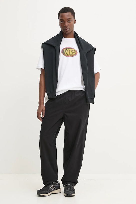 Эти брюки из коллекции Vans сшиты из тонкой, неэластичной ткани, изготовленной из исключительно комфортного хлопка. - Изделия, отмеченные логотипом Globe VR3 с шахматным узором, представляют собой самые экологичные модели Vans, изготовленные из переработанных, полученных ответственным образом или возобновляемых материалов. - Брюки свободные в области бедер и ягодиц. - Прямая нога полной длины. - Эластичный пояс и дополнительная регулировка ширины с помощью шнурков для предотвращения сползания во время движения. - Два боковых накладных кармана. - Два накладных кармана на ягодицах.