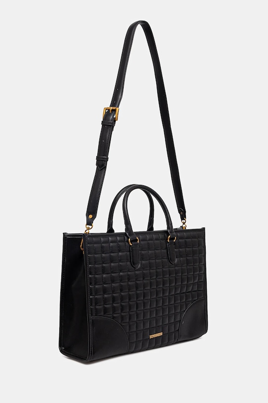 Большая сумка из коллекции Steve Madden. Модель на молнии, выполнена из экокожи. В комплект входит чехол. - Данное изделие частично изготовлено из переработанного полиэстера. - Магнитная застежка. - Имеет ручки и съемный регулируемый ремень. - Вмещает формат А4. - Модель оснащена металлическими ножками, защищающими дно сумки. - Модель на подкладке. - Входящий в комплект тканевый чехол защищает изделие от пыли. - Три внутренних кармана: один на молнии, два накладных. - Передние карманы на молнии. - Глубина: 13 см. - Высота: 30 см. - Ширина у основания: 42,5 см.
