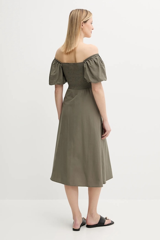 Это платье из коллекции Answear.LAB выполнено из тонкой, слегка эластичной ткани. Содержание полиэстера делает материал менее мнущимся. - Простой дизайн, не стесняющий движений. - Декоративный, заостренный вырез. - Короткие, пышные рукава. - Рукава отделаны удобными эластичными манжетами. - Эластичная вставка обеспечивает индивидуальную посадку. - Застегивается сбоку на потайную молнию. - Верхняя часть платья с дополнительным слоем материала в виде подкладки. - Длина: 108 см. - Ширина под мышками: 40 см. - Ширина талии: 33 см. - Размеры указаны для размера: S.
