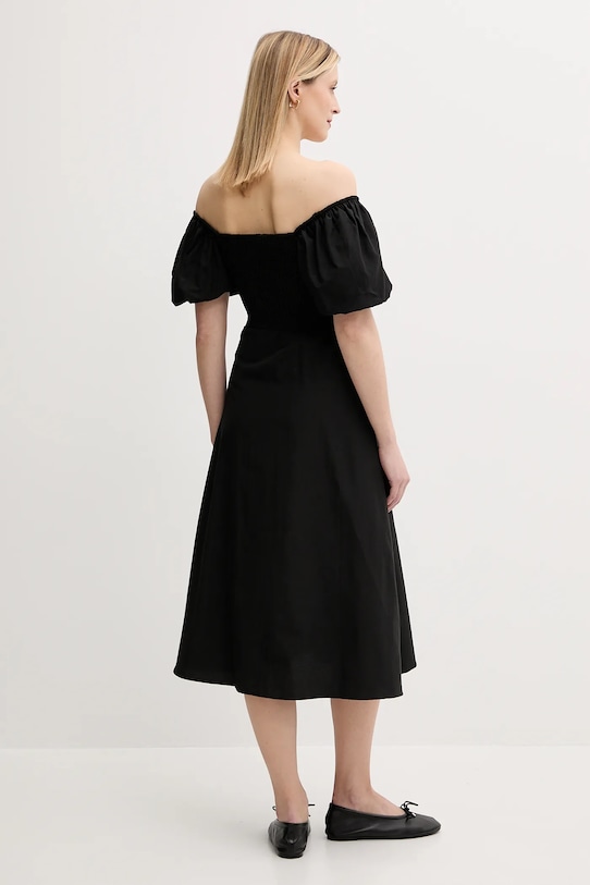 Это платье из коллекции Answear.LAB выполнено из тонкой, слегка эластичной ткани. Содержание полиэстера делает материал менее мнущимся. - Простой дизайн, не стесняющий движений. - Декоративный, заостренный вырез. - Короткие, пышные рукава. - Рукава отделаны удобными эластичными манжетами. - Эластичная вставка обеспечивает индивидуальную посадку. - Застегивается сбоку на потайную молнию. - Верхняя часть платья с дополнительным слоем материала в виде подкладки. - Длина: 108 см. - Ширина под мышками: 40 см. - Ширина талии: 33 см. - Размеры указаны для размера: S.