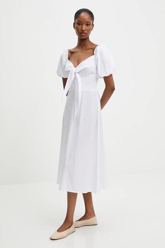 Это платье из коллекции Answear.LAB выполнено из тонкой, слегка эластичной ткани. Содержание полиэстера делает материал менее мнущимся. - Простой дизайн, не стесняющий движений. - Декоративный, заостренный вырез. - Короткие, пышные рукава. - Рукава отделаны удобными эластичными манжетами. - Эластичная вставка обеспечивает индивидуальную посадку. - Застегивается сбоку на потайную молнию. - Верхняя часть платья с дополнительным слоем материала в виде подкладки. - Длина: 108 см. - Ширина под мышками: 40 см. - Ширина талии: 33 см. - Размеры указаны для размера: S.