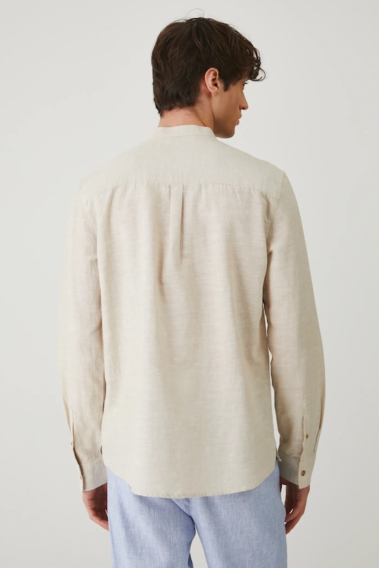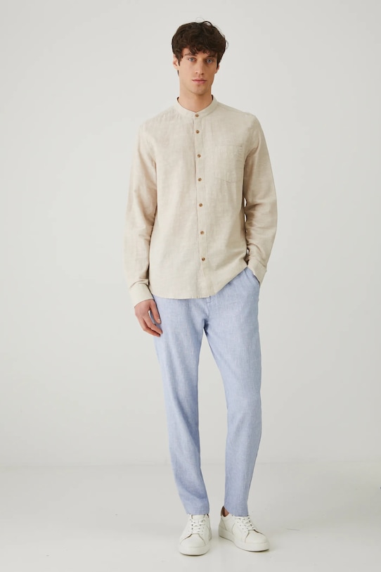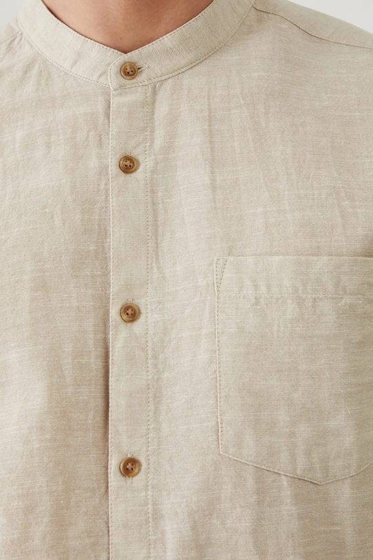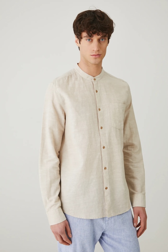 Эта рубашка из коллекции Medicine. Она сшита из меланжевой ткани и имеет воротник-стойку. - Рубашка прямого кроя мягко облегает фигуру, но не подчеркивает ее, обеспечивая свободу движений. - Длинный рукав. - Манжеты на пуговицах. - Модель с воротником-стойкой. - Застежка на пуговицы. - Накладной карман на груди. - Меланжевая ткань. - Льняной материал обеспечивает комфорт и воздухопроницаемость. - Длина рукава: 68 см. - Длина: 78 см. - Ширина груди: 57,5 см. - Окружность воротника-стойки: 45 см. - Ширина плеч: 48,6 см. - Размеры указаны для размера: L.