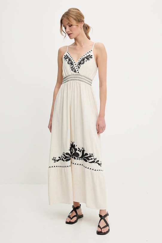 Это платье из коллекции Answear.LAB выполнено из ткани с декоративной вышивкой. Модель выполнена из дышащего материала с высоким содержанием вискозы. - Расклешенный крой. - Верхняя часть платья с дополнительным слоем материала в виде подкладки. - Острый вырез-конверт. - Регулируемые бретели обеспечивают оптимальную поддержку груди и позволяют индивидуально подогнать по фигуре, не раздражая кожу на плечах. - Эластичная вставка обеспечивает индивидуальную посадку. - Модель с декоративными оборками. - Длина: 140 см. - Ширина под мышками: 44 см. - Указаны размеры: S/M.