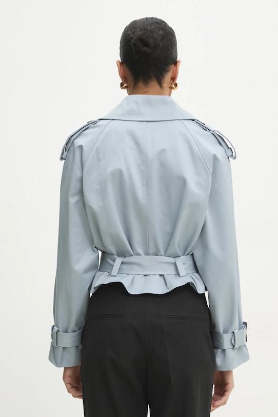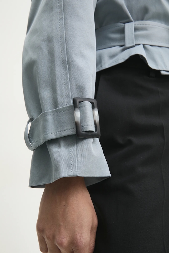 Короткий тренч из коллекции Answear.LAB. Модель без подкладки выполнена из гладкой ткани. Эта модель выполнена из исключительно комфортного и дышащего материала, идеально подходящего для теплого времени года. - Свободный крой, обеспечивающий полную свободу движений. - Рукава реглан благодаря своей конструкции обеспечивают большую свободу движений. - Модель на подкладке. - Расстегивающаяся модель. - Классические лацканы. - Текстильный ремешок в комплекте. - Длина рукава (от воротника): 69 см. - Длина: 50 см. - Ширина под мышками: 55 см. - Указаны размеры: XS/S.