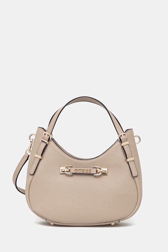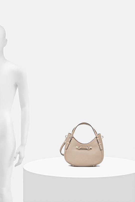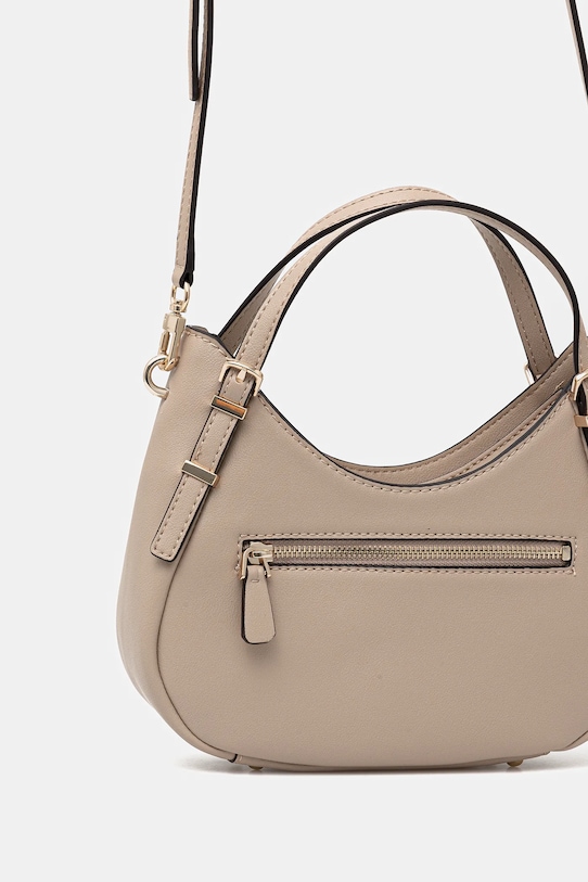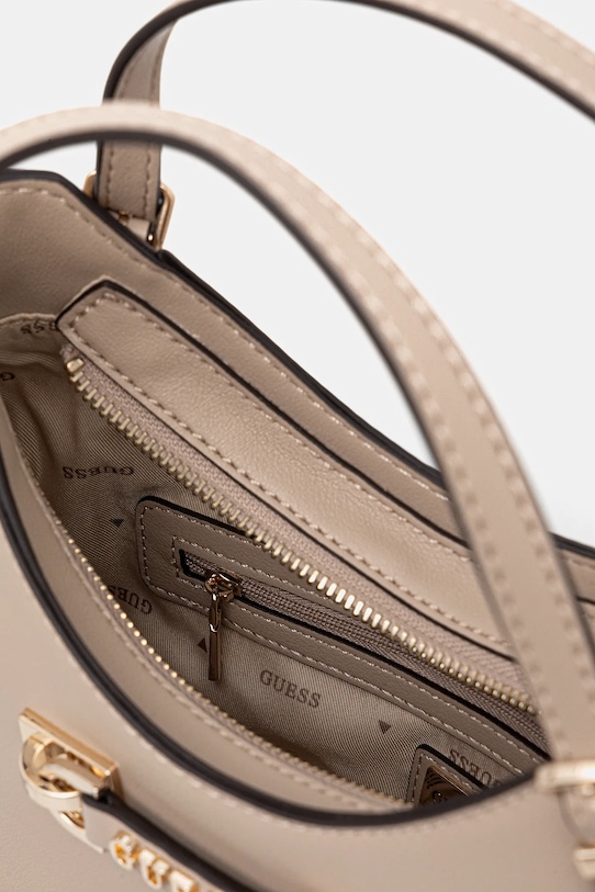 Небольшая сумочка из коллекции Guess. Модель на молнии, выполнена из экокожи. - Застежка-молния. - Внутренний карман на молнии. - Имеет внутренние отделения для карт. - Карман на молнии на задней стороне позволяет безопасно хранить телефон или другие мелкие предметы. - Модель на подкладке. - Не подходит для формата А4. - Имеет ручки и съемный регулируемый ремень. - Модель оснащена металлическими ножками, защищающими дно сумки. - Входящий в комплект тканевый чехол защищает изделие от пыли. - Глубина: 6,5 см. - Высота: 14 см. - Ширина у основания: 24 см.