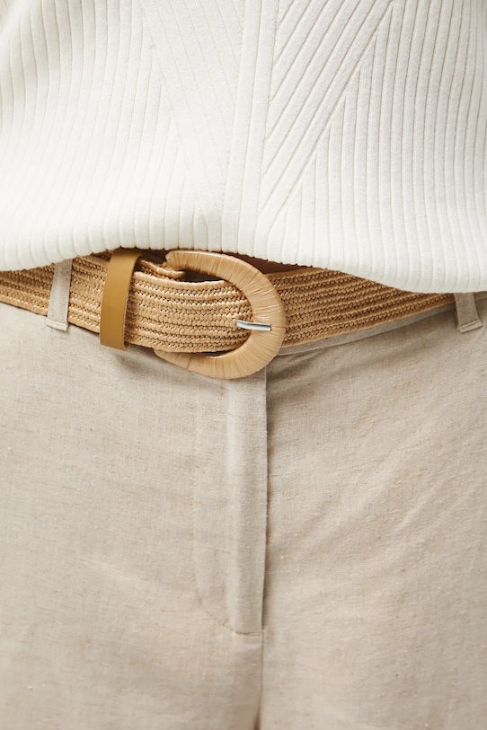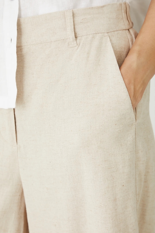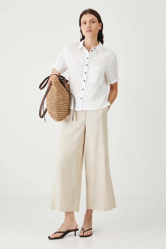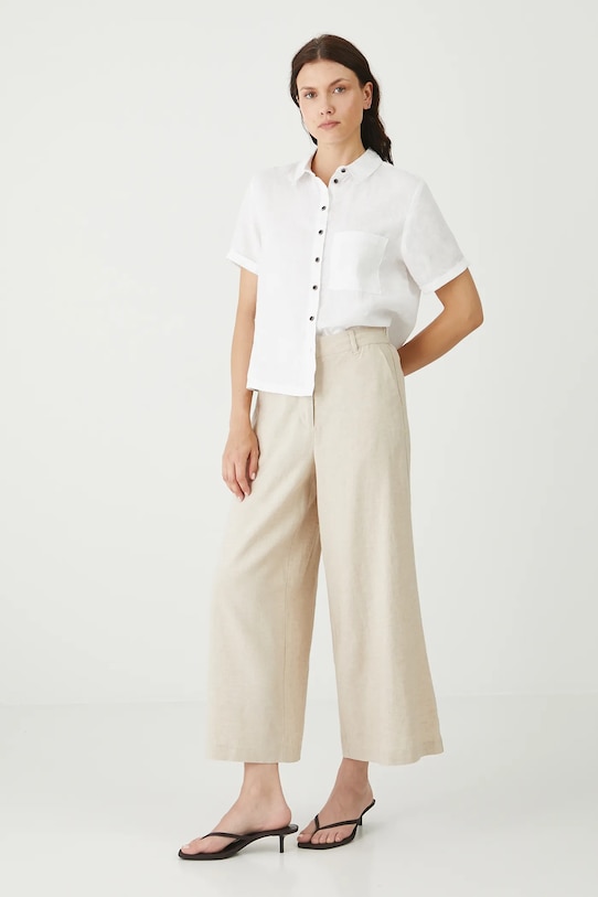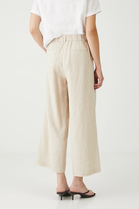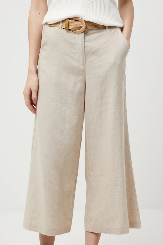 Брюки из коллекции «Медицина». Изготовлены из смеси льна и вискозы. - Льняной материал обеспечивает комфорт и воздухопроницаемость. - Фасон кюлотов. - Модель с высокой талией, застежкой на пуговицы и молнию. - Ремешок в комплекте. - Эластичная резинка сзади. - Накладные карманы. - Широкие штанины. - Гладкая ткань. - Ширина талии (до растягивания): 36,5 см. - Ширина талии (после растяжения): 40 см. - Ширина бедер: 51 см. - Высота талии: 30,5 см. - Ширина штанины внизу: 36 см. - Длина по внутреннему шву: 63 см. - Размеры указаны для размера: S.
