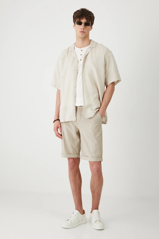 Шорты из коллекции Medicine. Изготовлены из смесовой льняной ткани. - Материал с добавлением льна обеспечивает комфорт и воздухопроницаемость. - Приталенный крой. - Модель со стандартной талией, застежкой на пуговицы и молнию. - Эластичный пояс. - Накладные карманы. - Меланжевая ткань. - Ткань саржевого переплетения. - Ширина талии (до растягивания): 41,5 см. - Ширина талии (после растяжения): 46 см. - Ширина бедер: 54 см. - Высота талии: 26,5 см. - Ширина штанины снизу: 25 см. - Размеры указаны для размера: M. - Длина по внутреннему шву: 26 см.