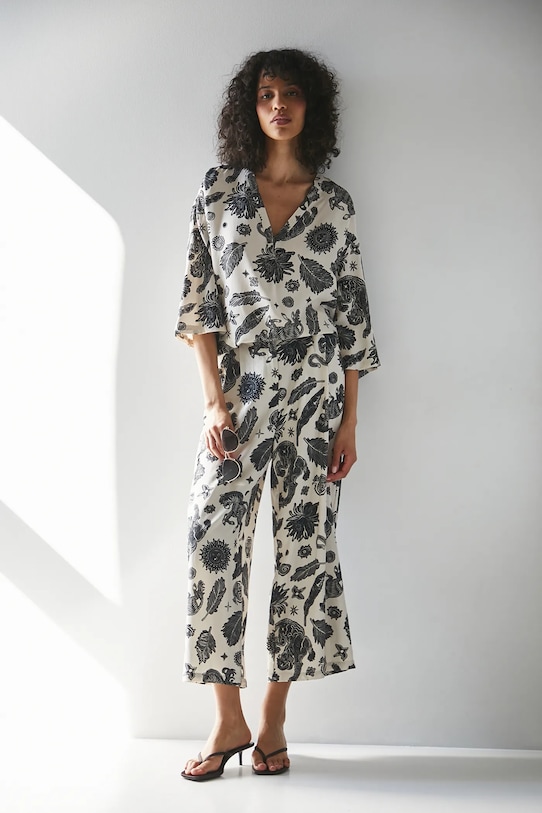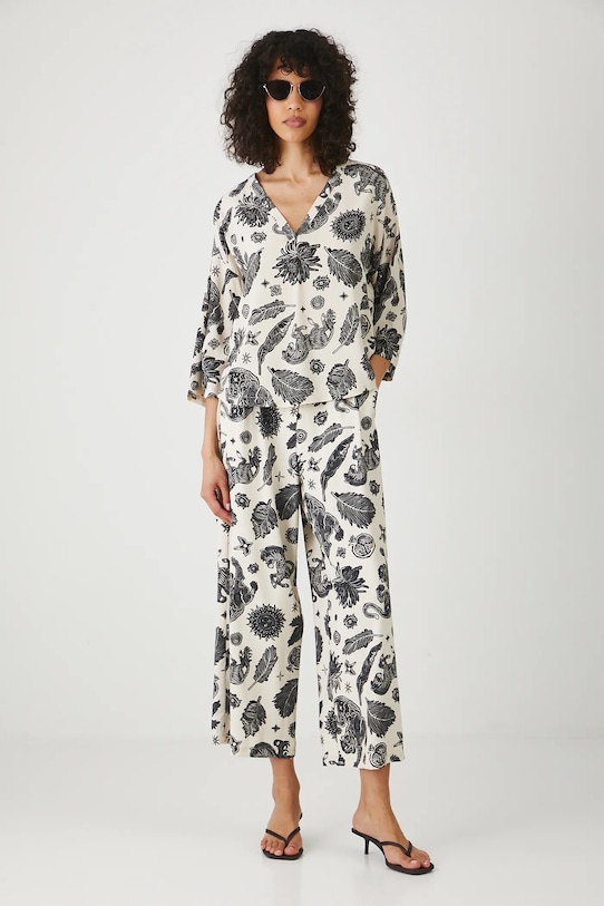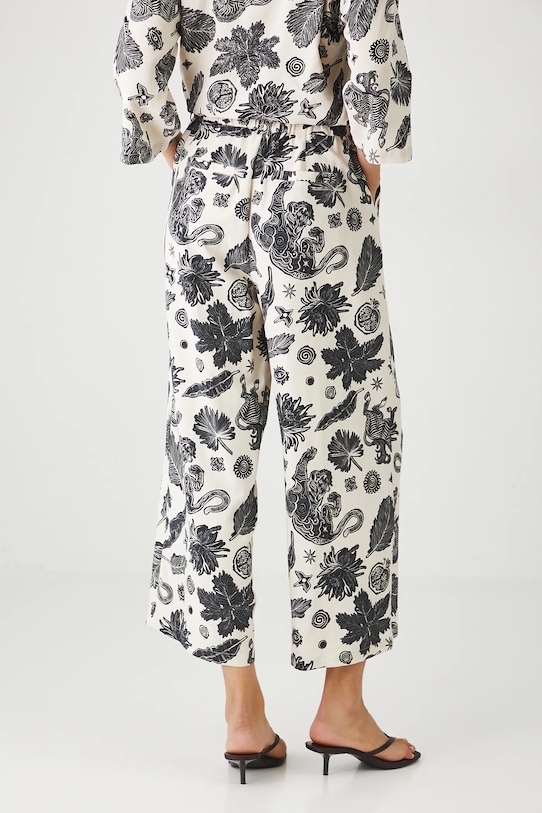 Брюки из коллекции Medicine. Изготовлены из смесовой льняной ткани. - Материал с добавлением льна обеспечивает комфорт и воздухопроницаемость. - Широкий фасон штанины. - Модель с высокой талией, застежкой на молнию и крючок. - Эластичная резинка сзади. - Накладные карманы. - Декоративные закладки. - Узорчатая ткань. - Ширина талии (до растягивания): 36,6 см. - Ширина талии (после растяжения): 40 см. - Ширина бедер: 58 см. - Высота талии: 31 см. - Ширина штанины внизу: 31,5 см. - Длина по внутреннему шву: 64 см. - Размеры указаны для размера: S.