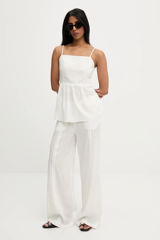 Этот комплект из коллекции Answear.LAB выполнен из гладкой ткани. Это лёгкий, воздушный материал, предназначенный для тёплого времени года. - Простой дизайн, не стесняющий движений. - Нерегулируемые, несъемные лямки. - Декоративная шнуровка на спине. - Модель с высокой талией, застежкой на пуговицы и молнию. - Два боковых накладных кармана. - Тонкая, неэластичная ткань. - Ширина талии: 36 см. - Ширина бедер: 56 см. - Высота талии: 34 см. - Длина штанины: 110 см. - Длина: 62 см. - Ширина под мышками: 45 см. - Размеры указаны для размера: S.