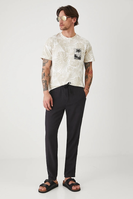 Брюки из коллекции Medicine. Изготовлены из смесовой льняной ткани. - Материал с добавлением льна обеспечивает комфорт и воздухопроницаемость. - Конусообразный стиль. - Модель со стандартной талией, застежкой на пуговицы и молнию. - Эластичный пояс со шнурками. - Два боковых накладных кармана. - Ткань саржевого переплетения. - Меланжевая ткань. - Ширина талии (до растягивания): 44 см. - Ширина талии (после растяжения): 48 см. - Ширина бедер: 57,5 см. - Высота талии: 29,3 см. - Длина по внутреннему шву: 79 см. - Размеры указаны для размера: L.