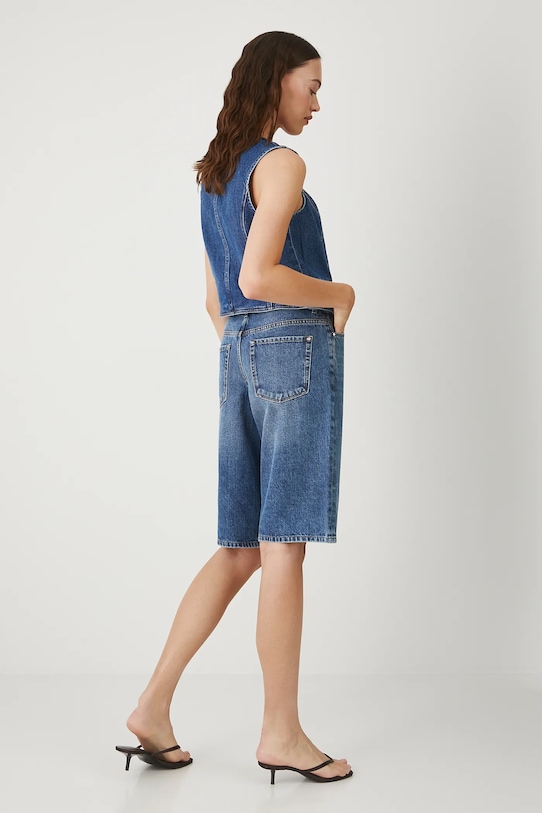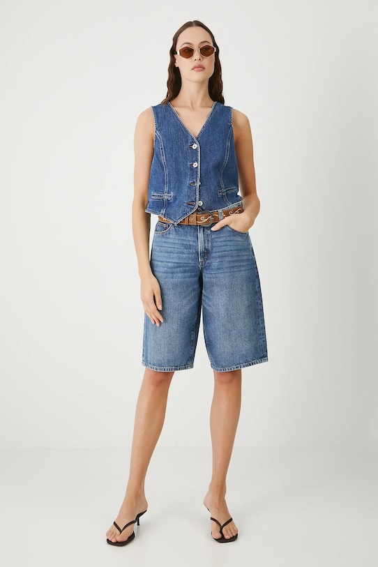 Шорты из коллекции Medicine. Изготовлены из хлопкового денима. - Материал с сертификатом OEKO-TEX Standard 100 гарантирует, что текстильные изделия, на которых он нанесен, не содержат вредных и потенциально опасных для человека и окружающей среды веществ. - Широкий фасон штанины. - Высокая талия. - Накладные карманы. - Застежка на пуговицы и молнию. - Слегка выстиранный деним. - Ширина талии: 39 см. - Ширина бедер: 51 см. - Высота талии: 27 см. - Ширина штанины внизу: 27 см. - Длина по внутреннему шву: 36,5 см. - Размеры указаны для размера: 36.