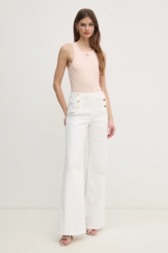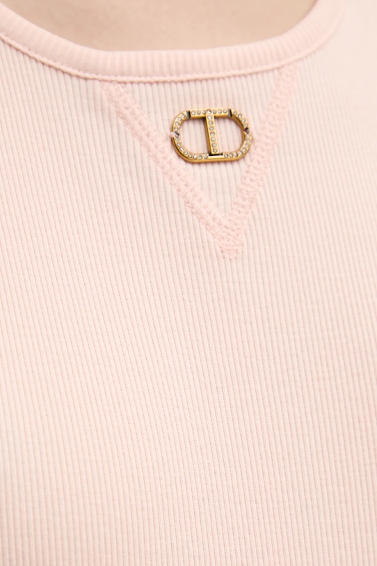 Этот топ из коллекции Twinset выполнен из тонкой эластичной ткани. Модель выполнена из исключительно комфортного хлопкового материала. - Приталенный крой, подчеркивающий силуэт. - Классический круглый вырез. - Трикотажное полотно в рубчик. - Длина: 52 см. - Ширина под мышками: 37 см. - Размеры указаны для размера: S.