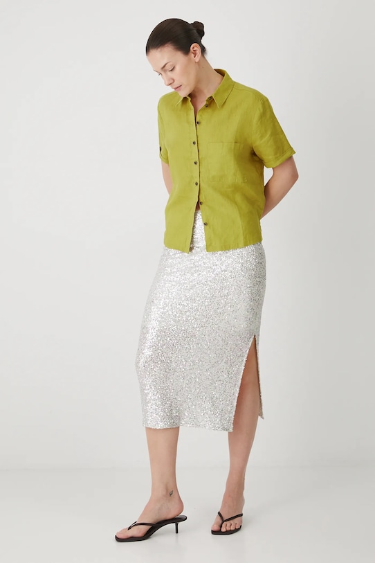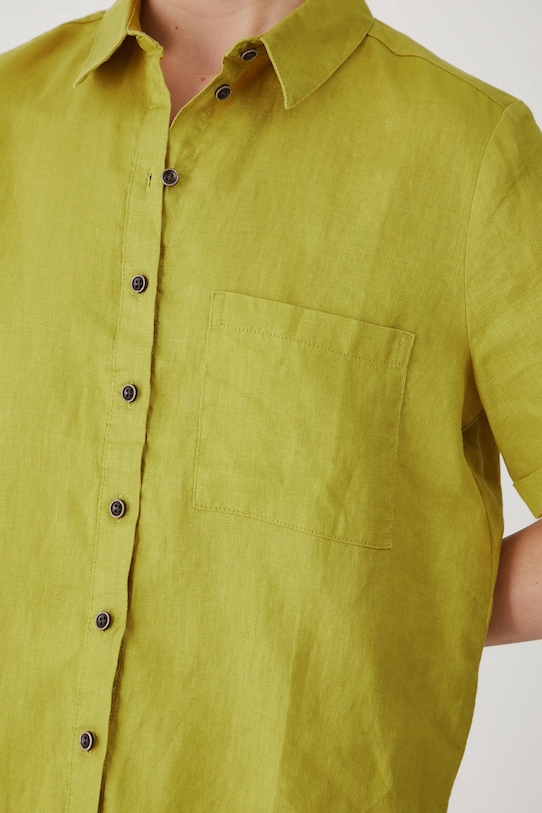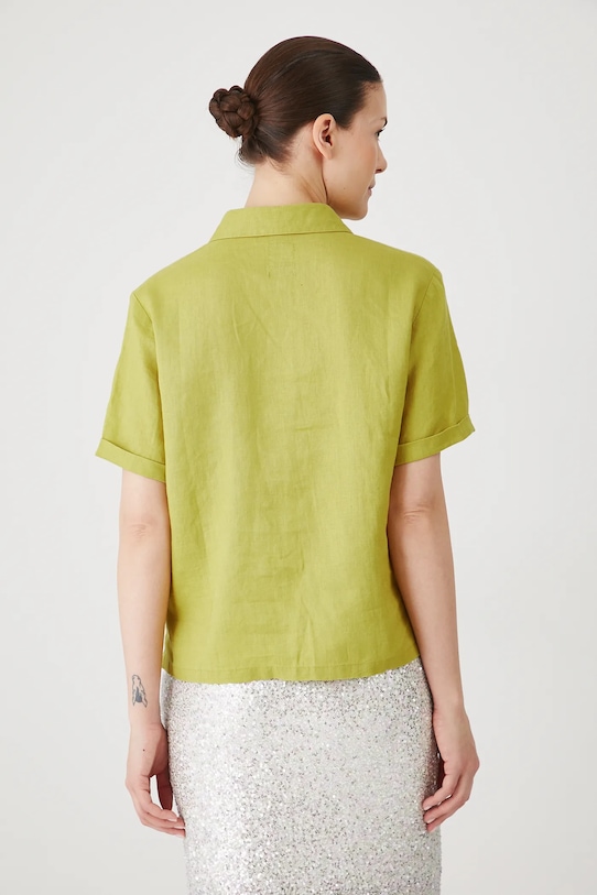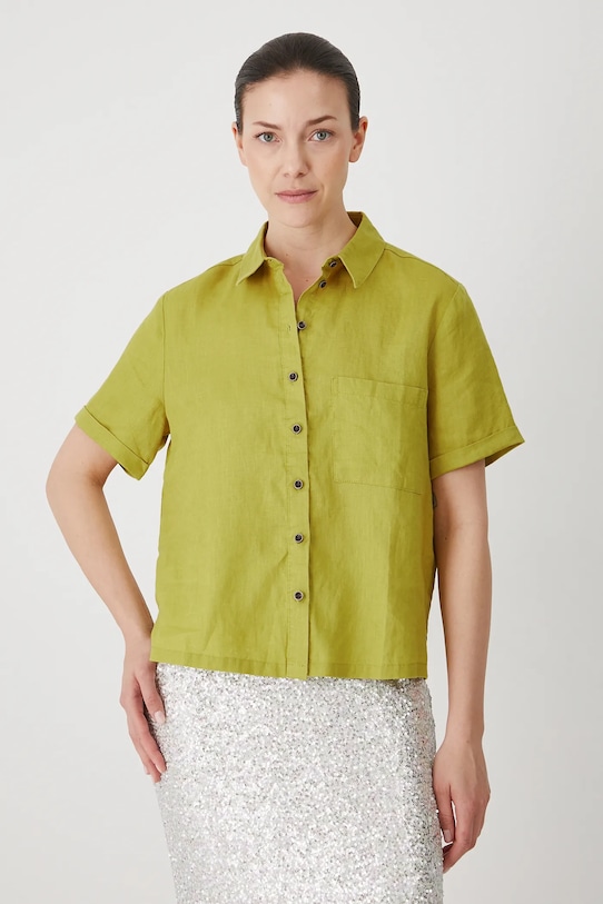 Рубашка из коллекции «Медицина». Изготовлена из льняной ткани, с воротником. - Материал с сертификатом OEKO-TEX Standard 100 гарантирует, что текстильные изделия, на которых он нанесен, не содержат вредных и потенциально опасных для человека и окружающей среды веществ. - Натуральный, воздушный и прочный материал, изготовлен из 100% льна. - Обычная посадка. - Короткий рукав. - Модель с воротником. - Застежка на пуговицы. - Накладной карман на груди. - Гладкая ткань. - Длина: 60 см. - Ширина под мышками: 53,5 см. - Размеры указаны для размера: S.