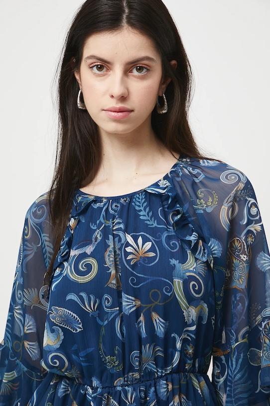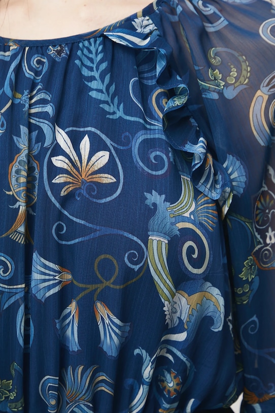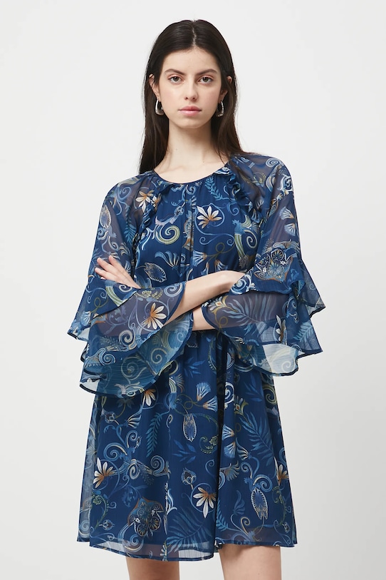 Платье из коллекции «Медицина». Расклешенный фасон из узорчатой ткани. - Расклешенный крой. - Рукав три четверти. - Рукав реглан. - Декоративные оборки на рукавах. - Круглый вырез. - Застегивается на пуговицы сзади. - Эластичный пояс. - Модель изготовлена из прозрачного материала. - Дополнительный слой материала в виде подкладки. - Узорчатая ткань. - Модель мини-длины. - Ширина талии (до растягивания): 31,5 см. - Ширина талии (после растяжения): 58 см. - Ширина груди: 56 см. - Длина: 93 см. - Размеры указаны для размера: S.