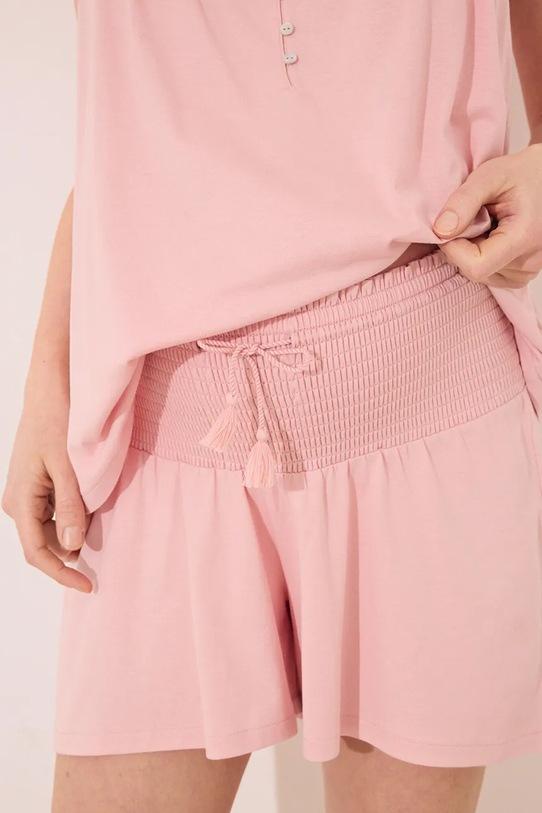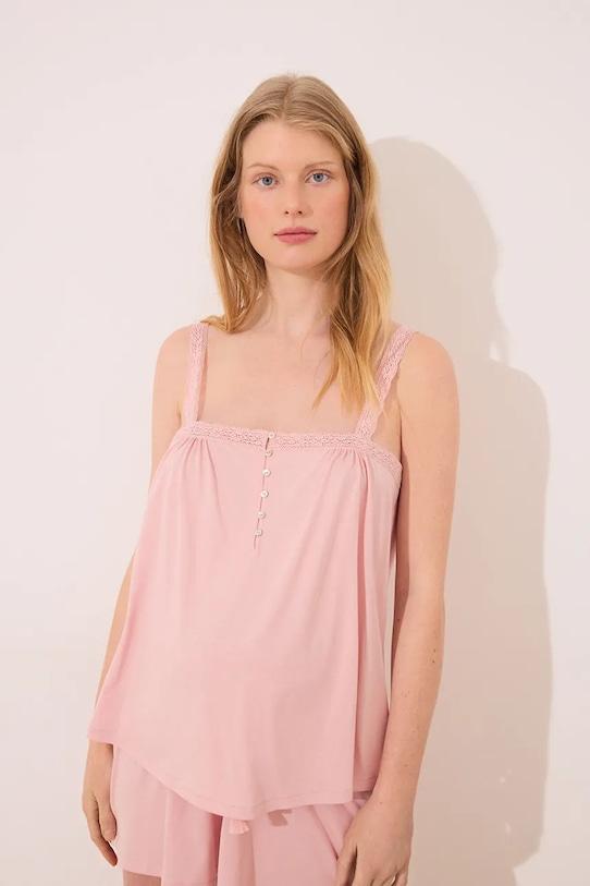 Пижама из коллекции Women'secret. Изготовлена из гладкой, эластичной ткани. – Инициатива «Лучший хлопок». Изделия с этой маркировкой содержат не менее 50% хлопка от розничного продавца или бренда, участвующего в инициативе «Лучший хлопок» и инвестирующего в развитие BCI. - Простой дизайн, не стесняющий движений. - Пижама состоит из топа и шорт. - Алмазный вырез. - Нерегулируемые, несъемные лямки. - Застежка на короткие пуговицы обеспечивает эффективную вентиляцию и легкость надевания и снимания. - Эластичный пояс со шнурками. - Тонкий материал.