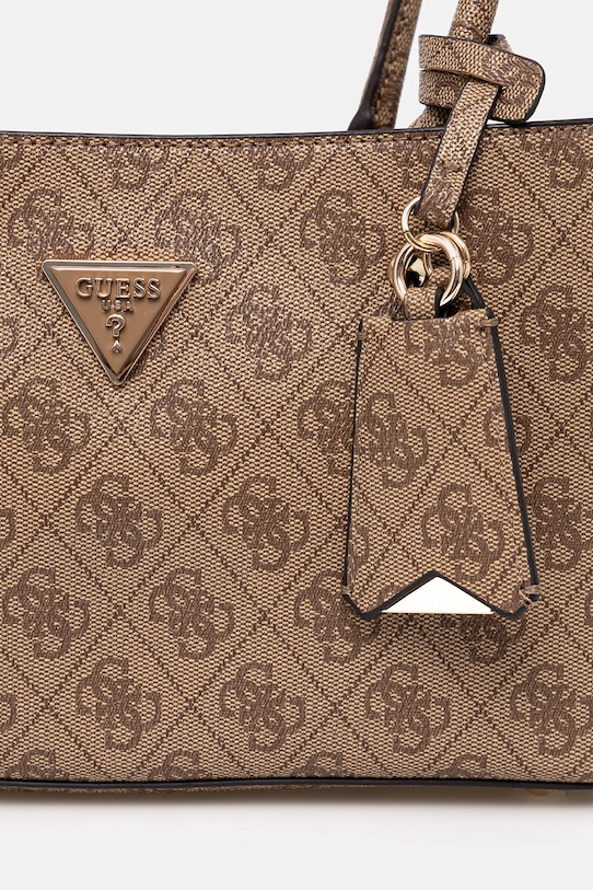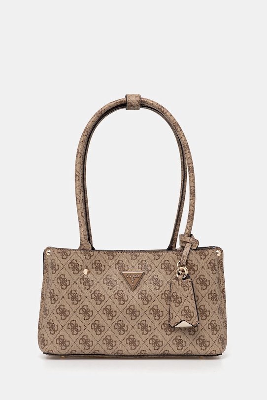 Небольшая сумочка из коллекции Guess. Модель на молнии, выполнена из экокожи. - Имеет три отделения: одно на молнии, два на магнитной застежке. - Три внутренних кармана: один на молнии, два накладных. - Модель на подкладке. - Не подходит для формата А4. - Модель оснащена металлическими ножками, защищающими дно сумки. - Длинные ручки для удобной переноски в руке или на плече. - В комплект модели входит брелок. - Входящий в комплект тканевый чехол защищает изделие от пыли. - Глубина: 10 см. - Высота: 17 см. - Ширина у основания: 27 см.