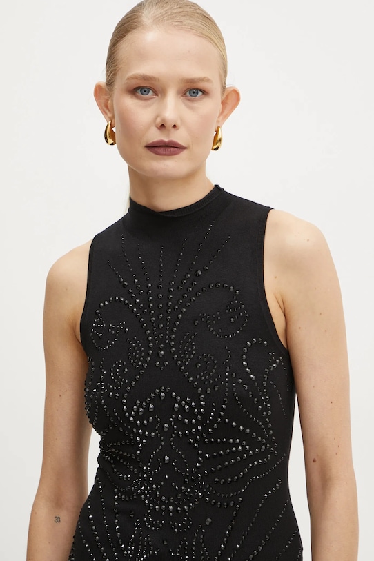 Жилет из коллекции Guess из трикотажного полотна с аппликацией. Модель выполнена из исключительно комфортного материала с высоким содержанием вискозы. - Частично изготовлен из LENZING ECOVERO, экологически чистого материала. LENZING ECOVERO производится из органической целлюлозы и древесной массы, используя на 50% меньше воды, чем популярная вискоза. - Приталенный крой, подчеркивающий силуэт. - Модель с водолазкой. - Модель со стразами. - Тонкий, эластичный трикотаж. - Длина: 54 см. - Ширина под мышками: 33 см. - Размеры указаны для размера: S.