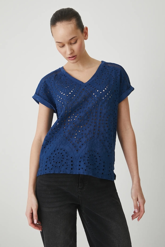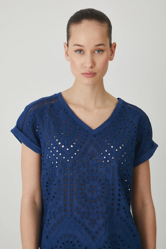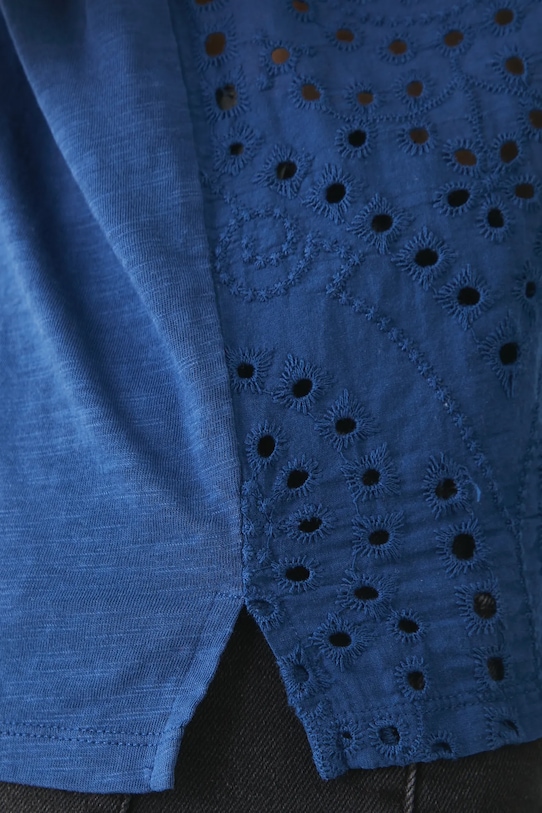 Футболка из коллекции «Медицина». Изготовлена из хлопка. - Материал с сертификатом OEKO-TEX Standard 100 гарантирует, что текстильные изделия, на которых он нанесен, не содержат вредных и потенциально опасных для человека и окружающей среды веществ. - Обычная посадка. - Короткие рукава кимоно. - Острый вырез. - Декоративные вставки. - Декоративные разрезы по бокам. - Модель с декоративной вышивкой. - Трикотажное полотно толстого переплетения с неровной текстурой. - Длина: 63 см. - Ширина груди: 54 см. - Размеры указаны для размера: S.