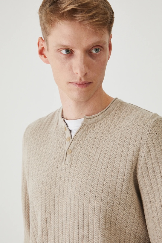 Свитер из коллекции Medicine. Этот свитер с застёжкой на пуговицы выполнен из меланжевого трикотажа. - Этот свитер прямого кроя обеспечивает комфорт и универсальный вид. Он мягко облегает фигуру, не перетягивая её. Классический и простой, он прекрасно сочетается как с элегантными, так и с повседневными образами. - Длинный рукав. - Острый вырез. - Короткая планка с пуговицами. - Отделка ребер. - Материал с текстурой. - Меланжевый трикотаж. - Длина рукава: 66,5 см. - Длина: 72 см. - Ширина груди: 57 см. - Размеры указаны для размера: L.