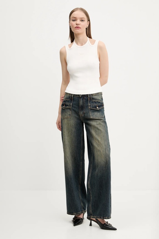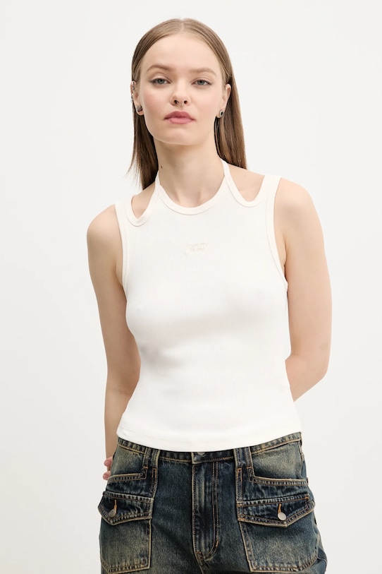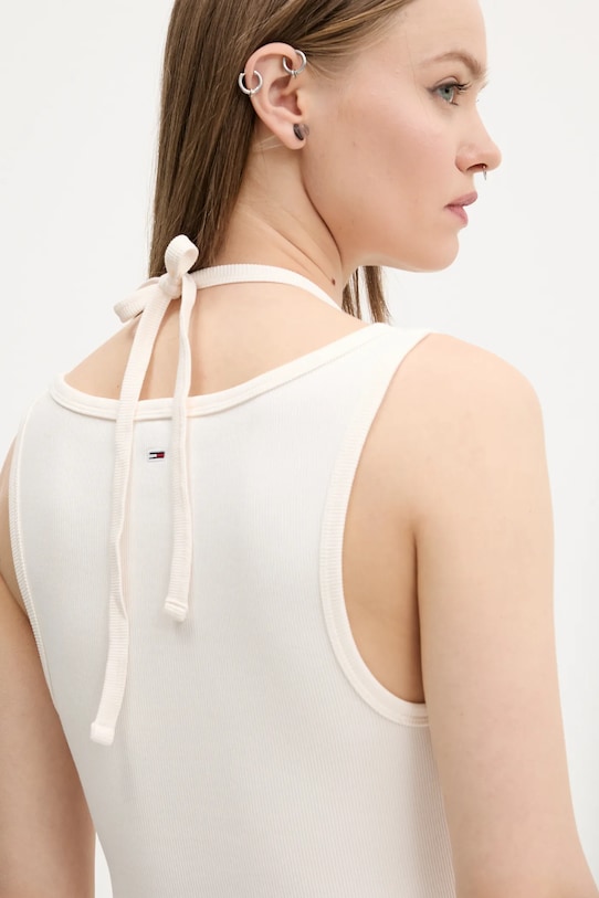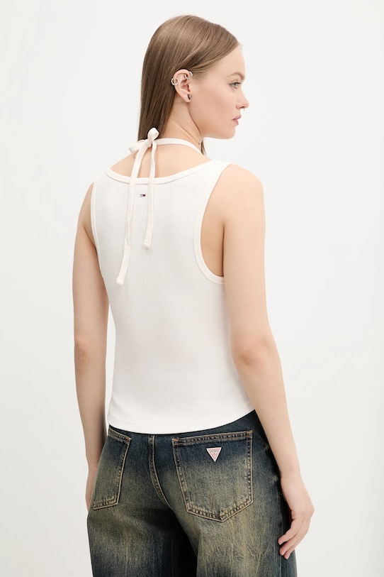 Этот топ из коллекции Tommy Jeans выполнен из трикотажного полотна в рубчик. Оптимальная эластичность материала обеспечивает полную свободу движений. Модель частично построена из материалов, полученных в результате регенеративного земледелия, что позволяет фермерам подстраиваться под ритмы природы. Такой подход к земледелию обеспечивает более длительный отдых и восстановление растений, что приводит к улучшению питания сельскохозяйственных животных и оздоровлению почвы. - Приталенный крой, подчеркивающий силуэт. - Нерегулируемые, несъемные бретели с завязками на шее.