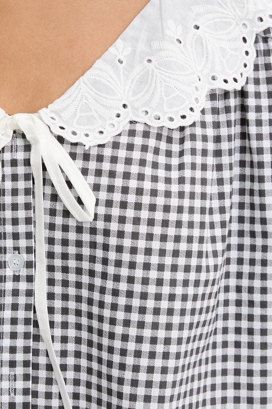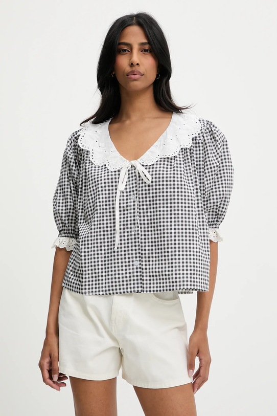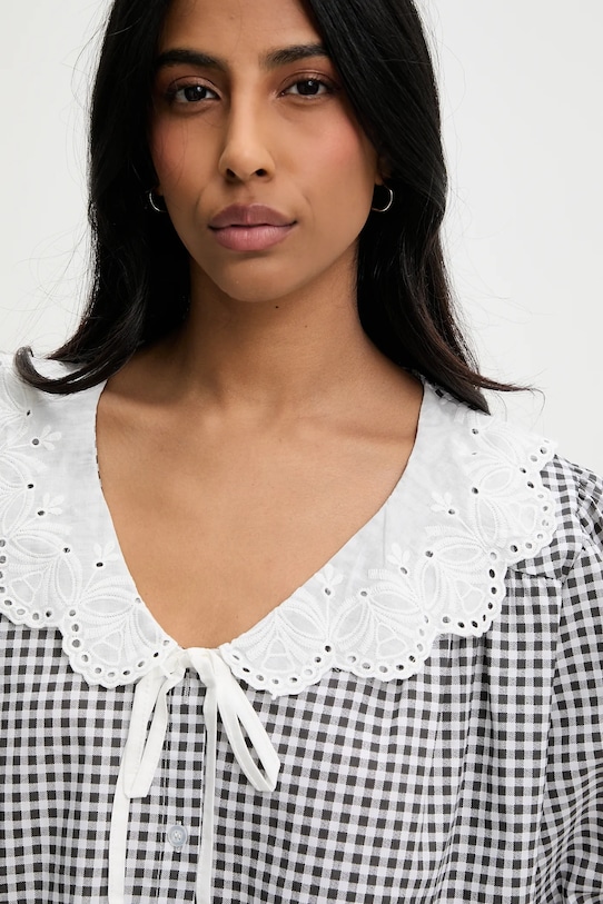 Эта блузка из коллекции Answear.LAB выполнена из тонкой, эластичной ткани. Модель выполнена из исключительно комфортного, дышащего хлопкового материала. - Свободный крой, обеспечивающий полную свободу движений. - Модель с большим декоративным воротником. - Рукава три четверти с удобной эластичной манжетой. - Модель с рукавами-буфами. - Декоративная окантовка по вырезу горловины. - Удобная застежка на кнопки позволяет легко надевать и снимать. - Узорчатая ткань. - Длина: 52 см. - Ширина под мышками: 65 см. - Указаны размеры: S/M.