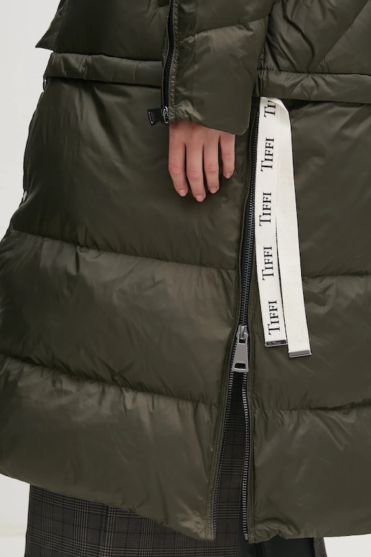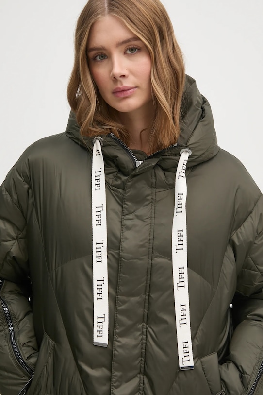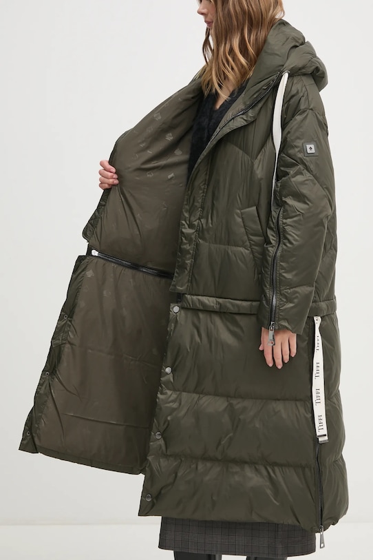 Пуховик из коллекции Tiffi. Эта утеплённая модель выполнена из гладкого материала. Съёмное дно позволяет использовать его в двух вариантах. - Наполнитель - натуральный пух и перья. - Свободный покрой. - Застежка-молния. - Поднятый воротник. - Капюшон с завязками. - Накладные карманы. - Завязки на талии. - Лоскутное шитье. - Модель на подкладке. - Молнии по бокам куртки. - Молнии по низу рукавов. - Длина рукава (от капюшона): 75 см. - Длина: 121 см. - Ширина под мышками: 64 см. - Размеры указаны для размера: S.