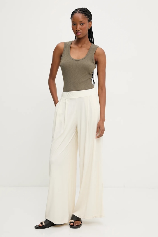 Эти брюки Answear.LAB изготовлены из тонкой эластичной ткани. Они исключительно удобные и дышащие, что делает их идеальными для теплого времени года. - Брюки свободные в области бедер и ягодиц. - Прямая нога полной длины. - Высокая талия с резинкой предотвращает скольжение во время движения. - Два боковых накладных кармана. - Ширина талии: 33 см. - Ширина бедер: 64 см. - Высота талии: 31,5 см. - Ширина штанины внизу: 34 см. - Ширина штанины: 38 см. - Длина внешней части штанины: 106 см. - Размеры указаны для размера: S.