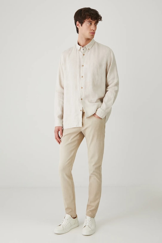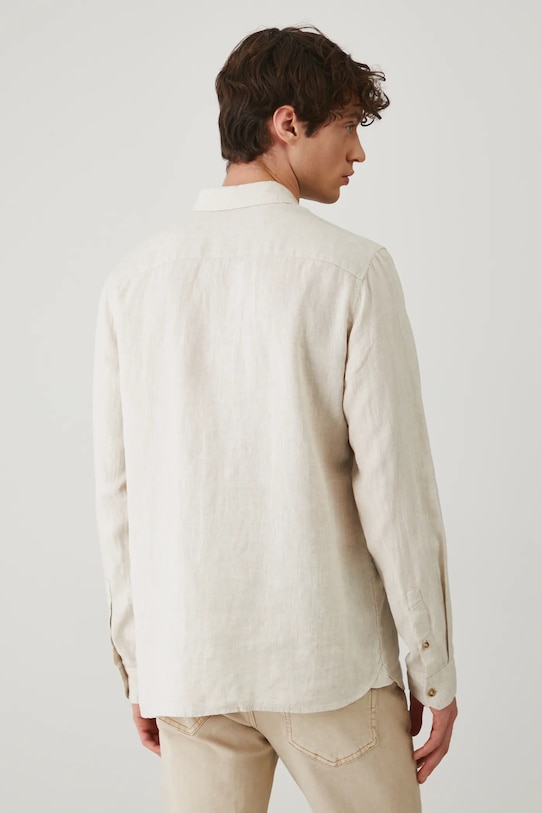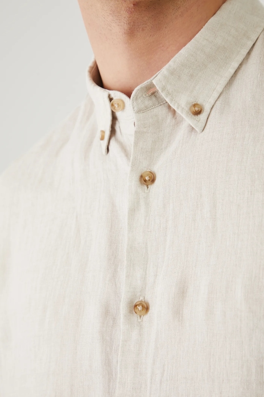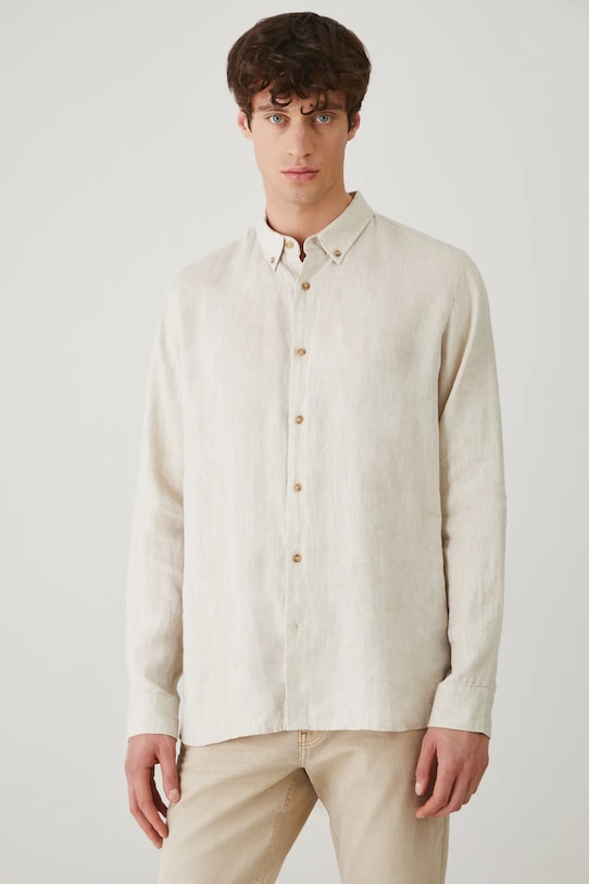 Эта рубашка из коллекции Medicine. Она сшита из льна и имеет воротник на пуговицах. - Натуральный, воздушный и прочный материал, изготовлен из 100% льна. - Рубашка прямого кроя мягко облегает фигуру, но не подчеркивает ее, обеспечивая свободу движений. - Длинный рукав. - Манжеты на пуговицах. - Воротник на пуговицах. - Застежка на пуговицы. - Меланжевая ткань. - Окружность воротника: 44,5 см. - Длина рукава: 68 см. - Длина: 77,6 см. - Ширина груди: 58,5 см. - Ширина плеч: 47,5 см. - Размеры указаны для размера: L.