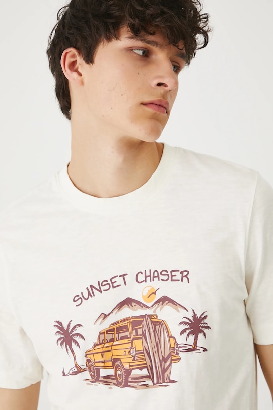 Футболка из коллекции «Медицина». Изготовлена из хлопкового трикотажа с принтом. - Материал с сертификатом OEKO-TEX Standard 100 гарантирует, что текстильные изделия, на которых он нанесен, не содержат вредных и потенциально опасных для человека и окружающей среды веществ. - Обычная посадка. - Короткий рукав. - Круглый вырез. - Модель с принтом. - Печать спереди с надписью: Sunset chaser. - Трикотажное полотно толстого переплетения с неровной текстурой. - Длина: 72 см. - Ширина груди: 54 см. - Размеры указаны для размера: M.