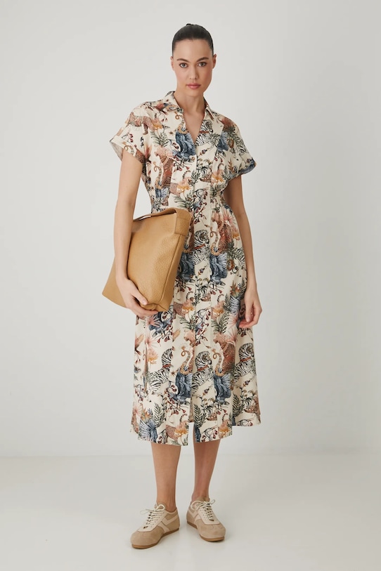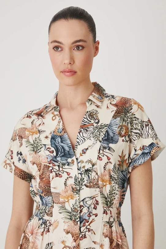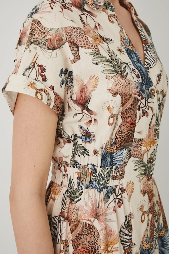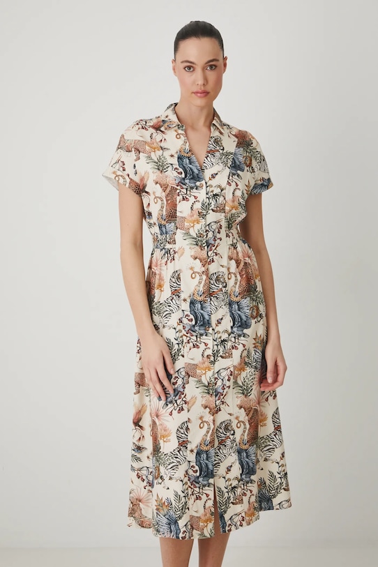 Платье из коллекции Medicine. Расклешенная модель из смесовой льняной ткани. - Материал с добавлением льна обеспечивает комфорт и воздухопроницаемость. - Расклешенный крой. - Короткие рукава кимоно. - Острый вырез с воротником. - Застежка на пуговицы. - Эластичный пояс. - Узорчатая ткань. - Узор с растительными и животными мотивами. - Модель длины миди. - Ширина талии (до растягивания): 35 см. - Ширина талии (после растяжения): 53 см. - Ширина груди: 57 см. - Длина: 128 см. - Размеры указаны для размера: S.