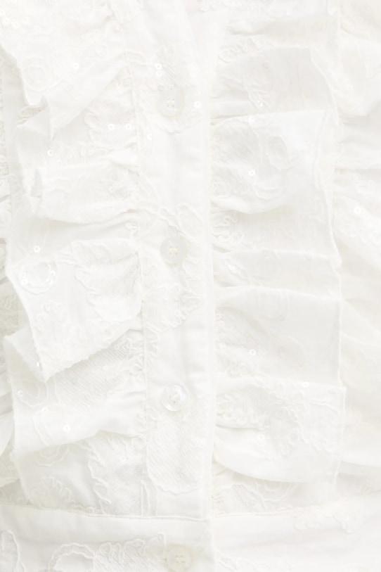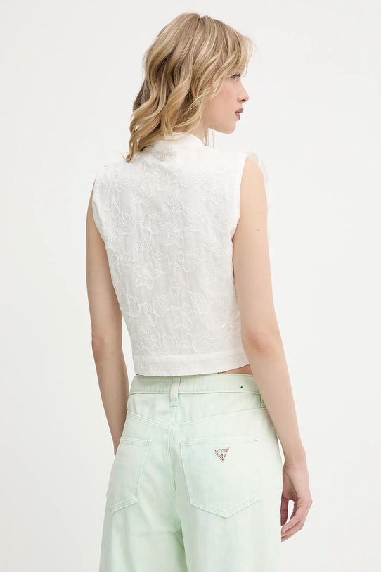 - Простой дизайн. - Модель без рукавов. - Острый вырез. - Застежка на пуговицы. - Модель на подкладке. - Модель с декоративными оборками. - Модель с декоративными пайетками. - Ширина под мышками: 44 см. - Длина: 51 см.