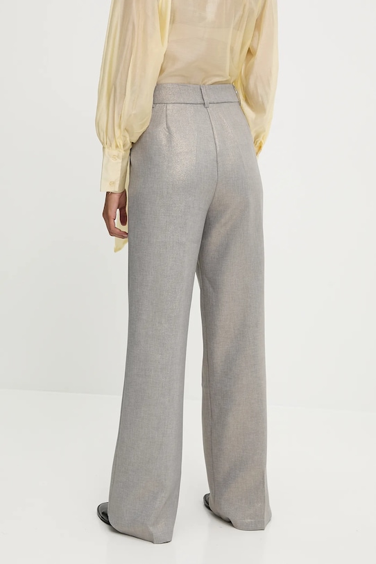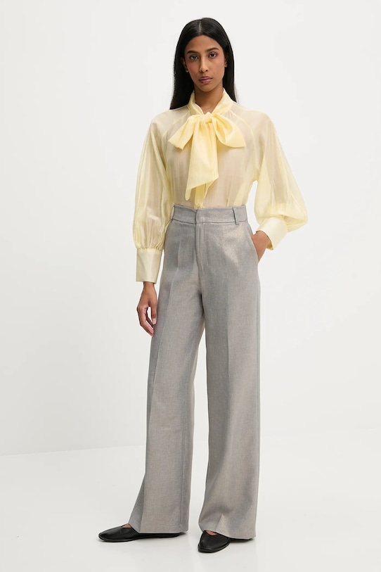 Брюки из коллекции Answear.LAB изготовлены из тонкой, неэластичной ткани. Полиэстер обеспечивает повышенную устойчивость к сминанию. - Брюки слегка приталенные на бедрах. - Прямая нога полной длины. - Модель с высокой талией, застежкой на молнию и крючок. - Два боковых накладных кармана. - Материал с металлической нитью. - Ширина талии: 36 см. - Ширина бедер: 50 см. - Высота талии: 32,5 см. - Ширина штанины внизу: 29 см. - Ширина штанины: 29,5 см. - Длина внешнего шва: 110 см. - Размеры указаны для размера: S.