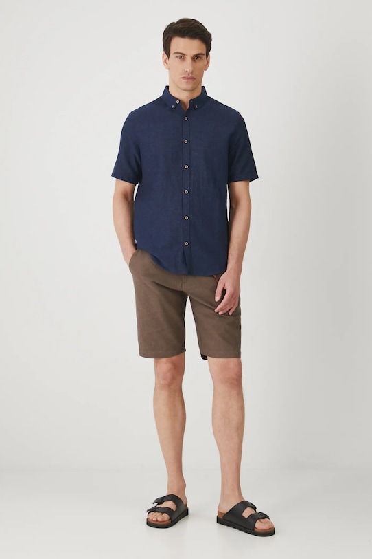 Эта рубашка из коллекции Medicine. Она сшита из смеси льна и хлопка. Воротник застёгивается на пуговицы. - Рубашка прямого кроя мягко облегает фигуру, но не подчеркивает ее, обеспечивая свободу движений. - Короткий рукав. - Воротник на пуговицах. - Застежка на пуговицы. - Ткань с неровной текстурой. - Меланжевая ткань. - Льняной материал обеспечивает комфорт и воздухопроницаемость. - Окружность воротника: 43,5 см. - Длина: 77,5 см. - Ширина груди: 58,5 см. - Ширина плеч: 47,5 см. - Размеры указаны для размера: L.