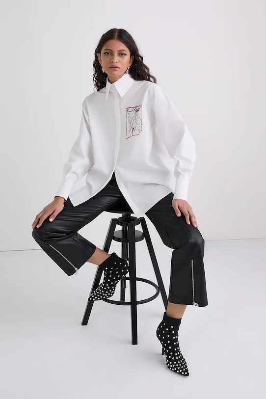 Рубашка из коллекции Карла Лагерфельда из хлопчатобумажной ткани. - Изделие изготовлено из органического хлопка. - Рубашка свободного кроя отличается свободным кроем, обеспечивает комфорт и не стесняет движений. - Удобная застежка на кнопки позволяет легко надевать и снимать. - Модель с принтом.