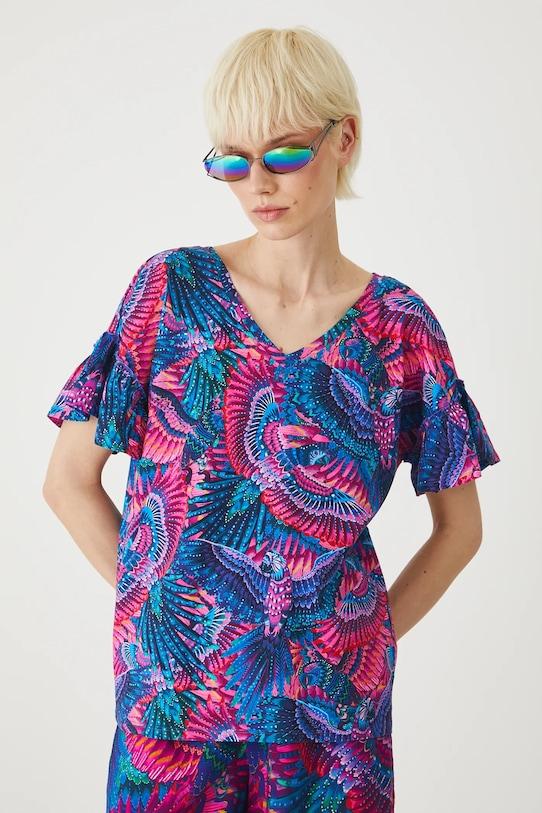 Футболка из коллекции «Медицина». Изготовлена из ткани с рисунком. - Материал с сертификатом OEKO-TEX Standard 100 гарантирует, что текстильные изделия, на которых он нанесен, не содержат вредных и потенциально опасных для человека и окружающей среды веществ. - Обычная посадка. - Короткие рукава кимоно. - Острый вырез. - Декоративный вырез сзади. - Декоративные оборки на рукавах. - Узорчатое трикотажное полотно. - Узор с изображением животных. - Длина: 63 см. - Ширина груди: 55 см. - Размеры указаны для размера: S.