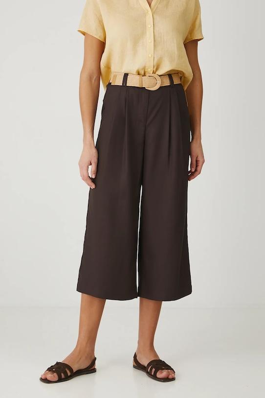 Брюки из коллекции «Медицина». Изготовлены из гладкой ткани. - Широкий фасон штанины. - Модель с высокой талией, застежкой на пуговицы и молнию. - Эластичный пояс. - Накладные карманы. - В комплект входит плетеный ремешок. - Декоративные закладки. - Укороченная нога. - Широкие штанины. - Гладкая ткань. - Ширина талии (до растягивания): 36 см. - Ширина талии (после растяжения): 40 см. - Ширина бедер: 58 см. - Высота талии: 32 см. - Длина по внутреннему шву: 57 см. - Размеры указаны для размера: S.