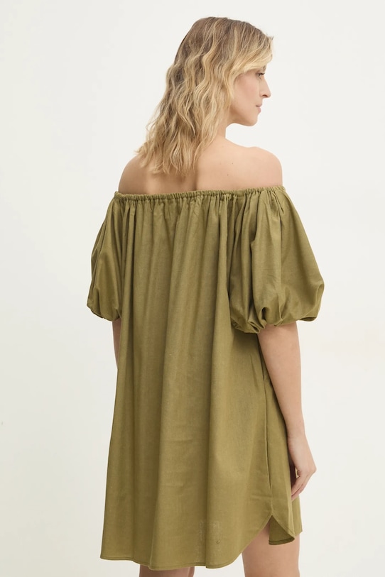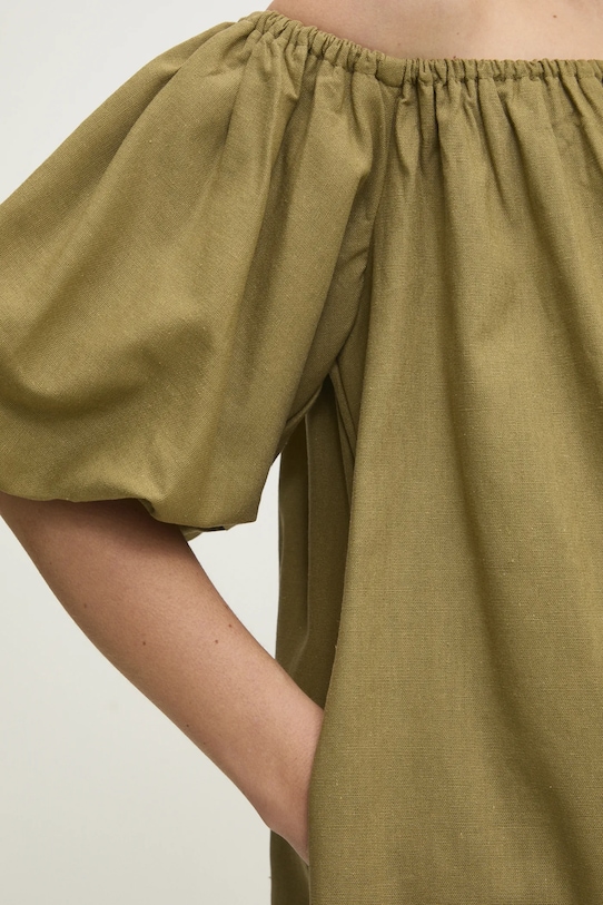 Это платье из коллекции Answear.LAB выполнено из тонкой, неэластичной ткани. Модель выполнена из исключительно комфортного материала с высоким содержанием вискозы. - Свободный крой, обеспечивающий полную свободу движений. - В зависимости от расположения рукавов его можно носить с испанским или круглым вырезом. - Короткий рукав. - Рукава отделаны резинкой. - Два боковых накладных кармана. - Модель без подкладки. - Модель без застежки. - Длина: 76 см. - Ширина под мышками: 52 см. - Размеры указаны для размера: S.
