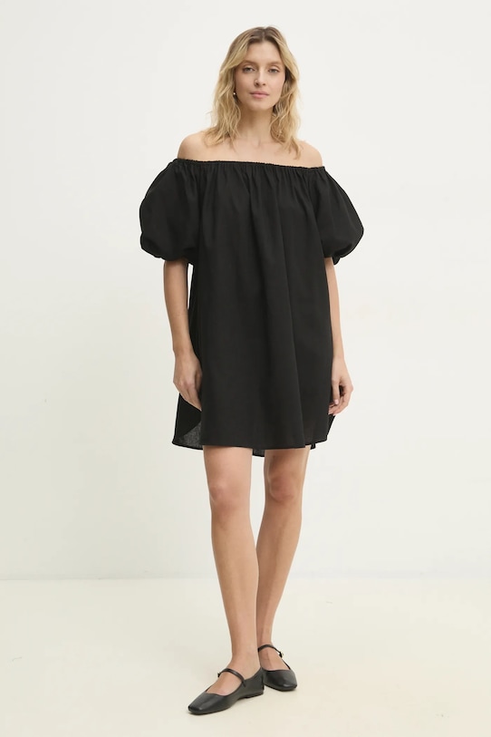 Это платье из коллекции Answear.LAB выполнено из тонкой, неэластичной ткани. Модель выполнена из исключительно комфортного материала с высоким содержанием вискозы. - Свободный крой, обеспечивающий полную свободу движений. - В зависимости от расположения рукавов его можно носить с испанским или круглым вырезом. - Короткий рукав. - Рукава отделаны резинкой. - Два боковых накладных кармана. - Модель без подкладки. - Модель без застежки. - Длина: 76 см. - Ширина под мышками: 52 см. - Размеры указаны для размера: S.
