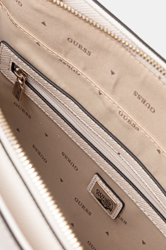 Небольшая сумочка из коллекции Guess. Модель на молнии, выполнена из экокожи. - Входящий в комплект тканевый чехол защищает изделие от пыли. - Клапан застегивается на магнит. - Имеет три отделения. - Модель на подкладке. - Не подходит для формата А4. - Внутренний карман на молнии. - Карман на молнии на задней стороне позволяет безопасно хранить телефон или другие мелкие предметы. - Несъемный, нерегулируемый ремешок. - Длина ремешка: 120 см. - Глубина: 6 см. - Высота: 16 см. - Ширина у основания: 23 см.