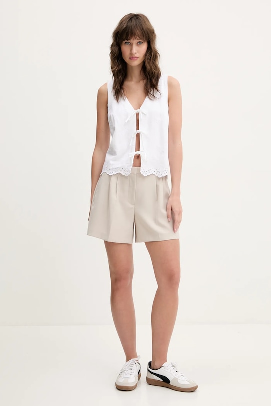 Эти шорты Abercrombie & Fitch изготовлены из тонкой, слегка эластичной ткани. Полиэстер обеспечивает лучшую устойчивость к сминанию. - Эта модель частично изготовлена из переработанного полиэстера. - Модель с высокой талией, застежкой на молнию, пуговицы и крючок. - Два боковых накладных кармана. - Декоративные закладки. - Имитация карманов на ягодицах. - Ширина талии: 39 см. - Ширина бедер: 50 см. - Высота талии: 27 см. - Ширина штанины внизу: 34 см. - Длина штанины: 35 см. - Размеры указаны для размера: 27.