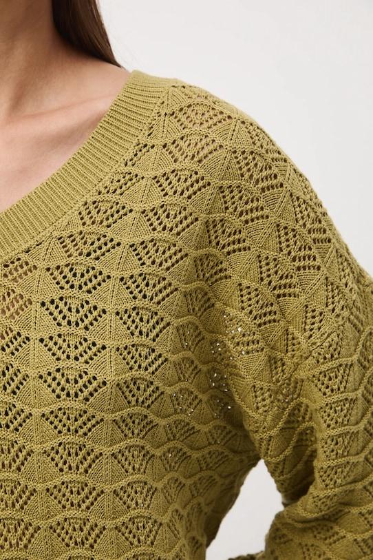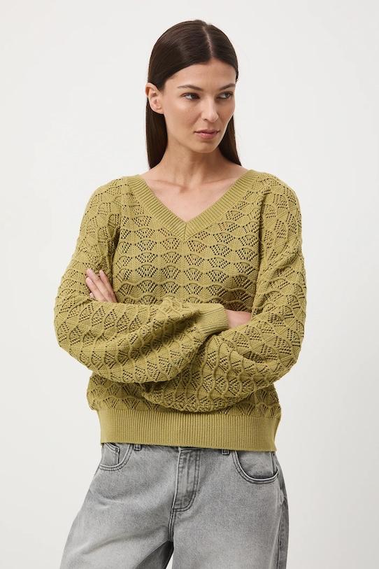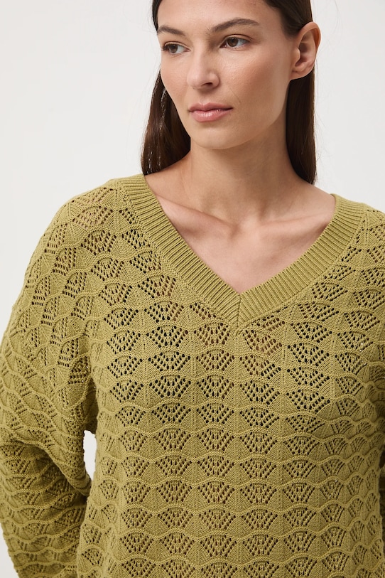 Свитер из коллекции Medicine. С острым вырезом и ажурным трикотажем. - Материал с сертификатом OEKO-TEX Standard 100 гарантирует, что текстильные изделия, на которых он нанесен, не содержат вредных и потенциально опасных для человека и окружающей среды веществ. - Обычная посадка. - Длинный рукав. - Заниженная линия плеча. - Острый вырез. - Отделка ребер. - Модель выполнена из ажурного материала. - Длина рукава (от горловины): 72,1 см. - Длина: 56,5 см. - Ширина груди: 53 см. - Размеры указаны для размера: S.