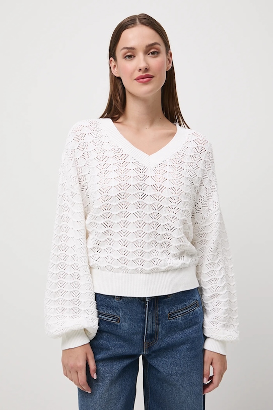 Свитер из коллекции Medicine. С острым вырезом и ажурным трикотажем. - Материал с сертификатом OEKO-TEX Standard 100 гарантирует, что текстильные изделия, на которых он нанесен, не содержат вредных и потенциально опасных для человека и окружающей среды веществ. - Обычная посадка. - Длинный рукав. - Заниженная линия плеча. - Острый вырез. - Отделка ребер. - Модель выполнена из ажурного материала. - Длина рукава (от горловины): 72,1 см. - Длина: 56,5 см. - Ширина груди: 53 см. - Размеры указаны для размера: S.
