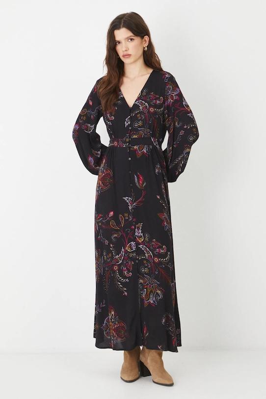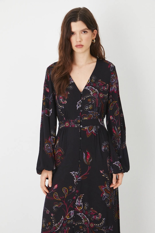 Платье из коллекции «Медицина». Расклешенный фасон из узорчатой ткани.